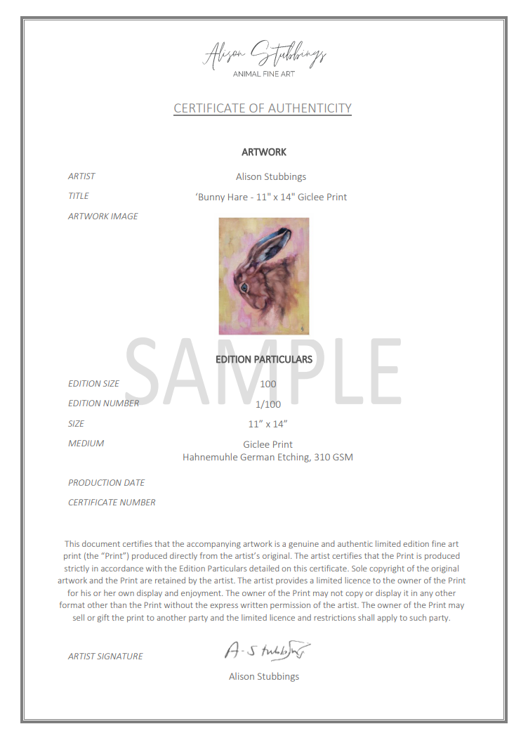 Limited Edition Giclee Print (of 100) of my original oil painting 'Bunny Hare', a beautiful British brown hare. I fell in love with the pose of this hare, the eye and ears really take centre stage. The pinks and yellows layered in the background add a contemporary and fresh feel to the painting.