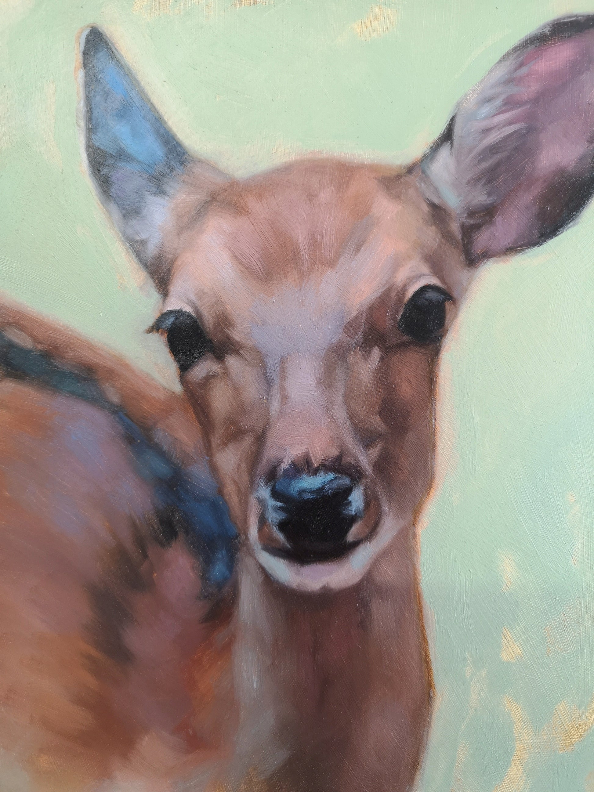 Original oil painting on panel of a beautiful, curious young fawn. Such delicate pretty features, always on high alert!
