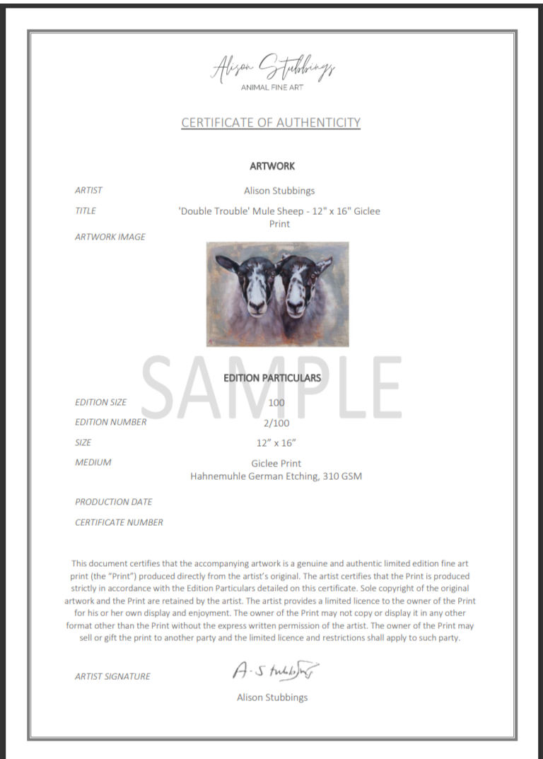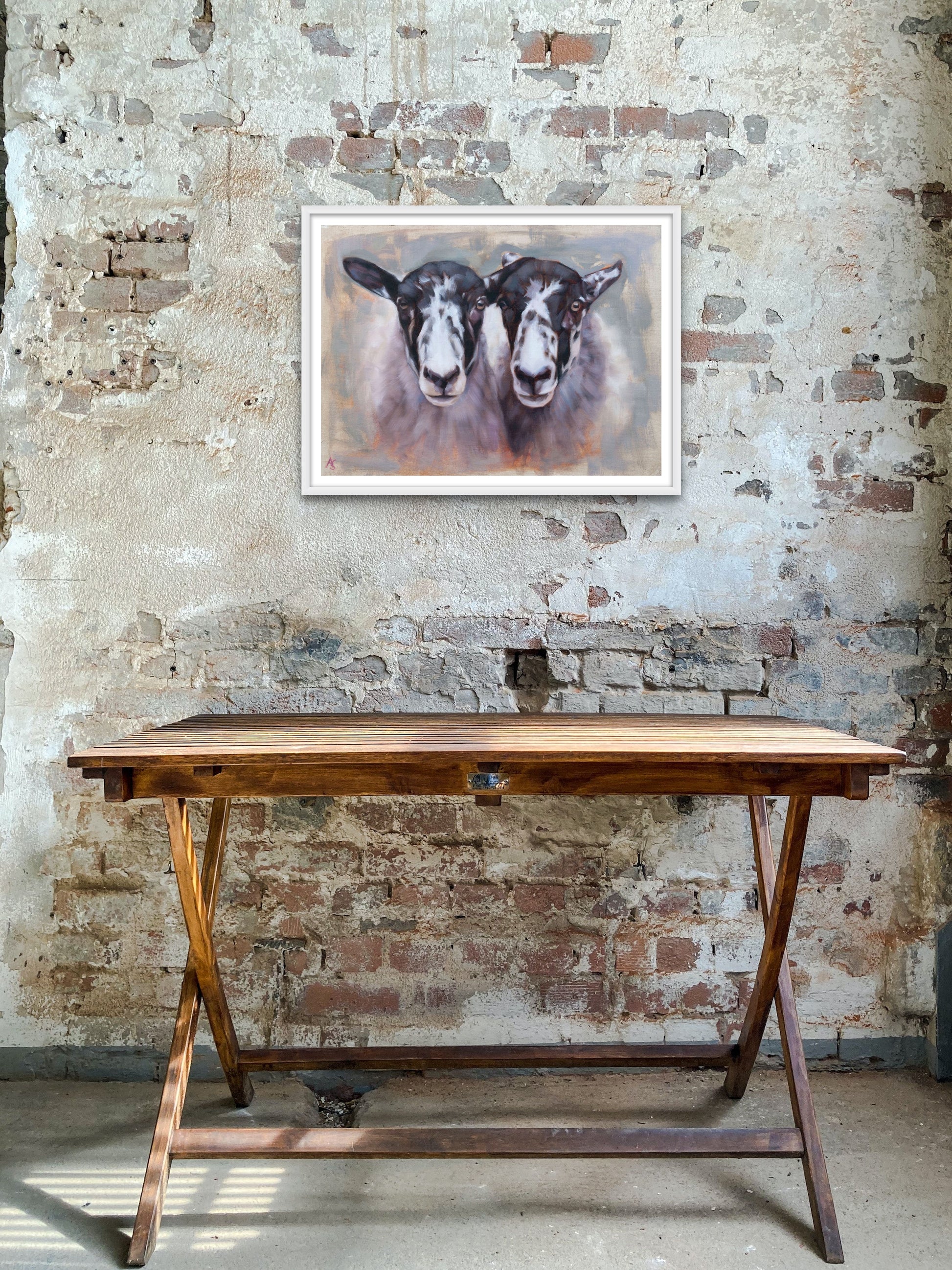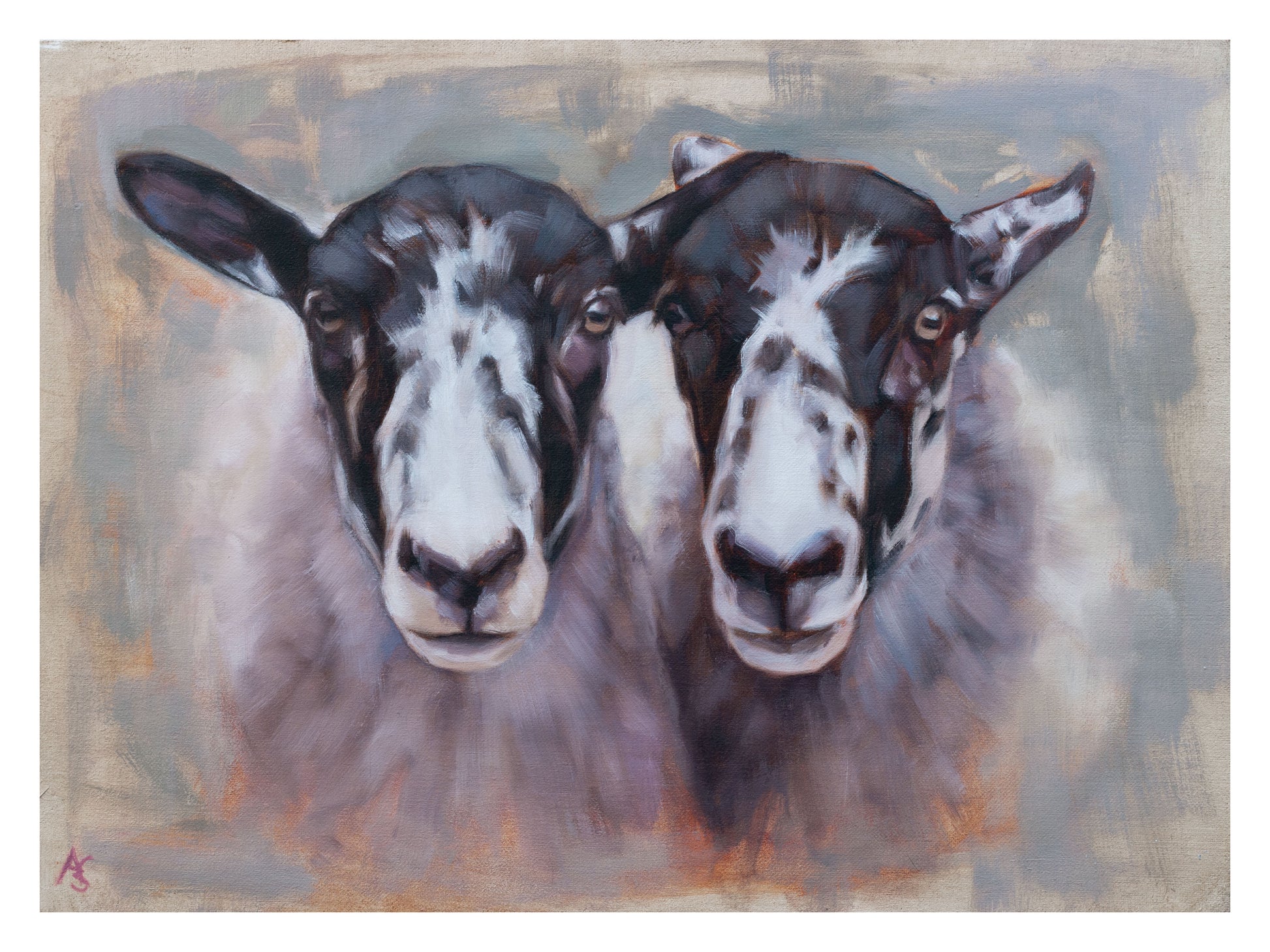 Limited Edition (of 100) Giclee Print of my original oil painting 'Double Trouble', a gorgeous pair of mule sheep. I love sheep for their inquisitive faces, and the beautiful array of markings amongst the different breeds. Mule sheep are among my favourites.
