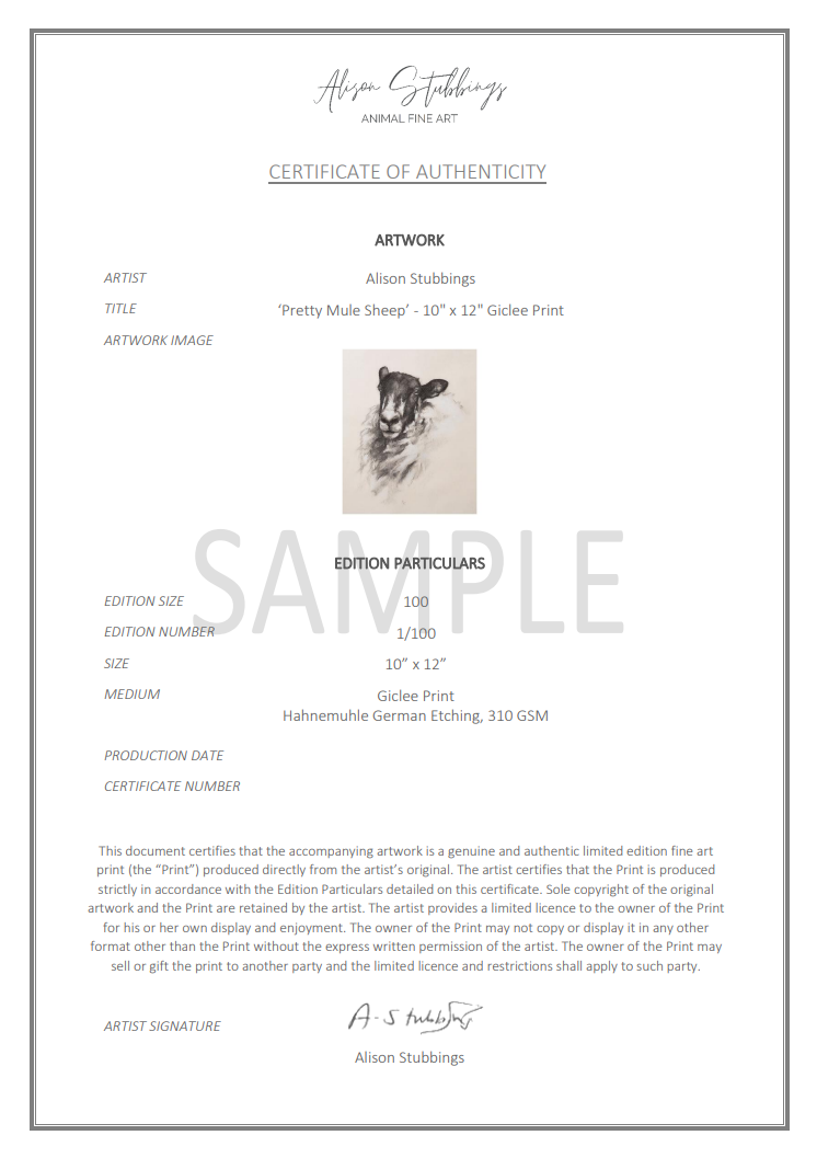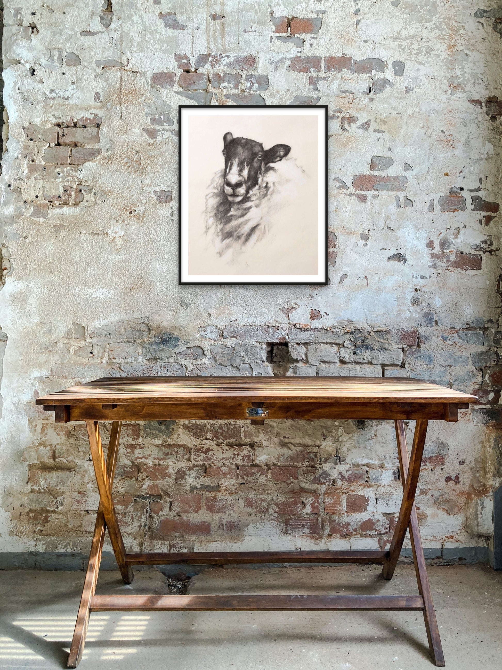 Limited Edition Giclee Fine Art Print (of 100) of my original charcoal drawing 'Pretty Mule Sheep'. I loved the expression of this lovely sheep and the contrast of her mostly black face against her white fluffy coat!